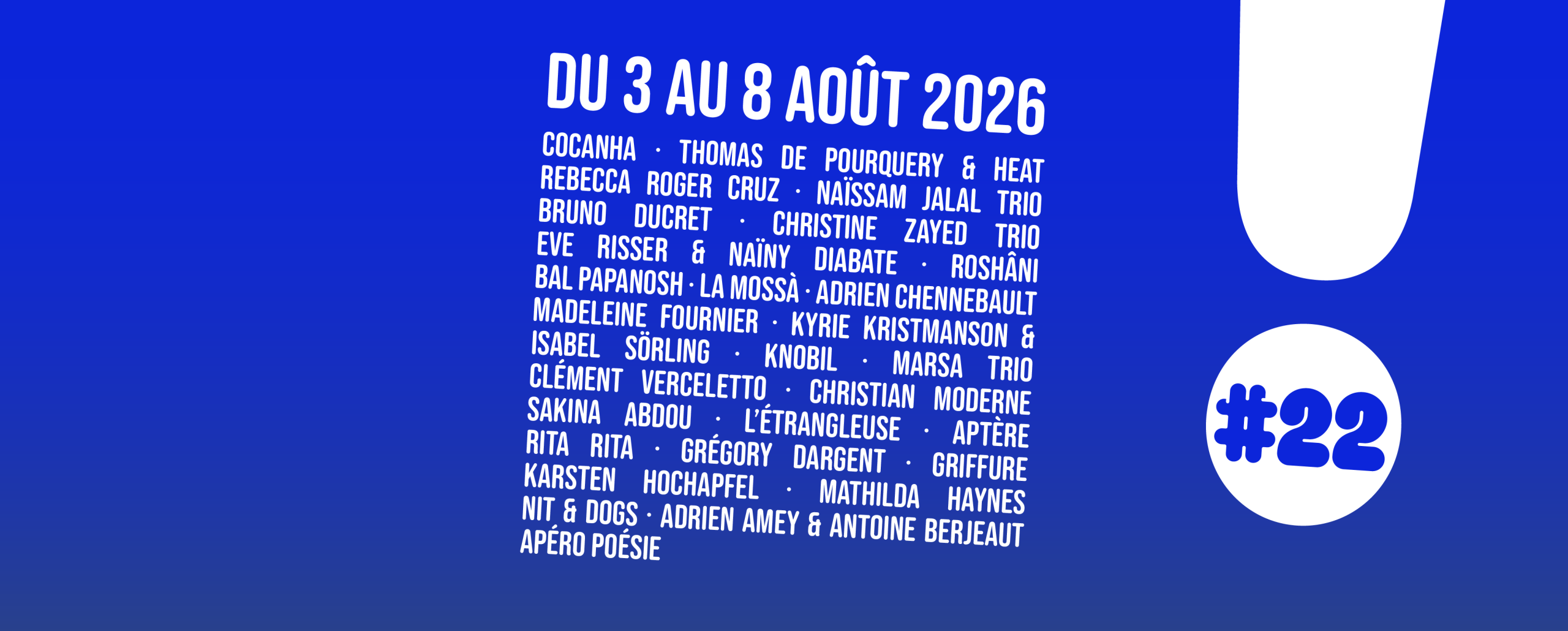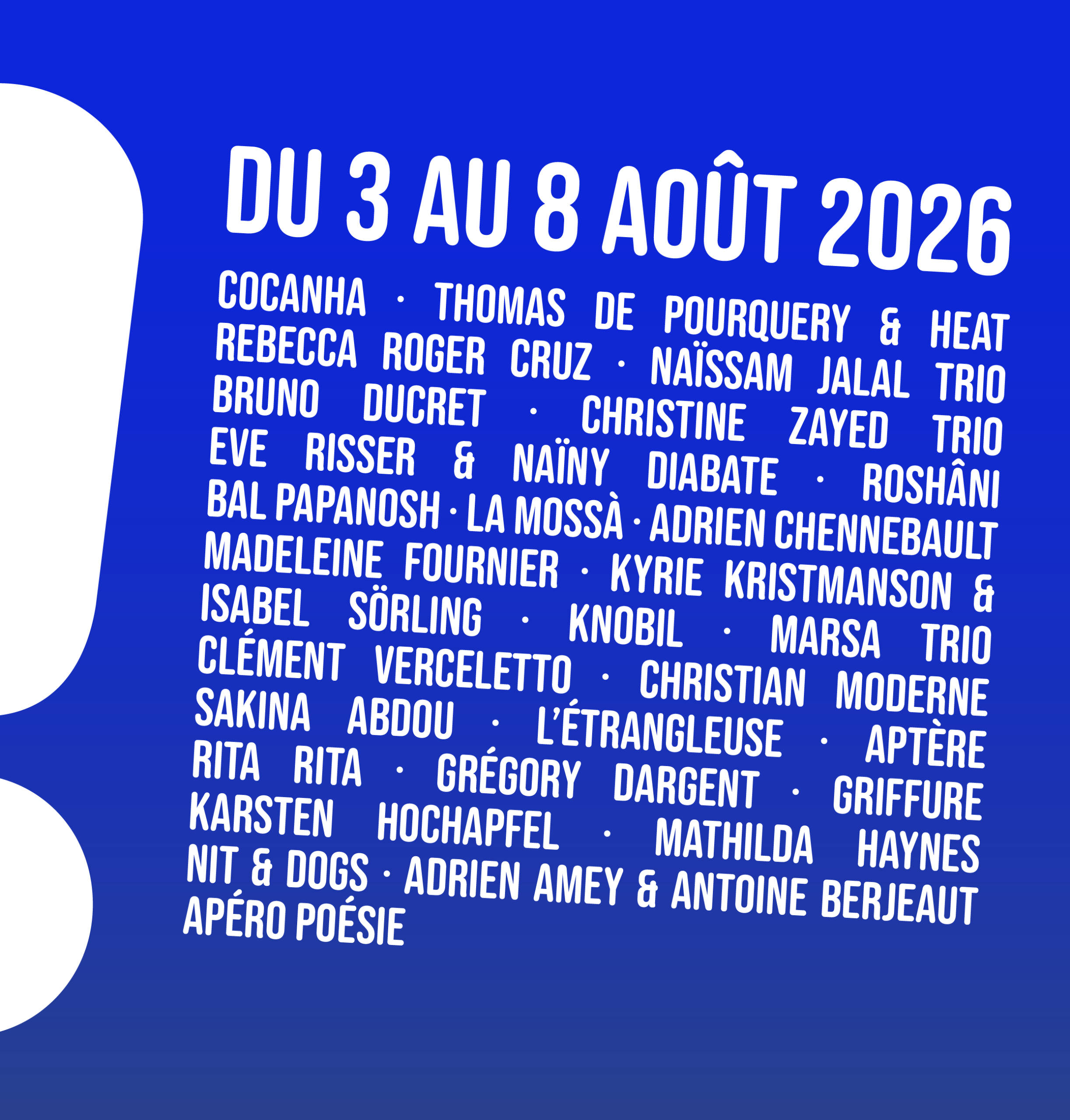 Rocé | Sarab | Bonbon Vodou | Leoni Leoni | Abdullah Miniawy | Hatice Özer « Koudour » | Guembri Superstar ft. Lova Lova | Quartet Kaija | Martin Debisschop « Visage-Village » | Robin Fincker & Janick Martin « Vison Visu » | Rizotomme | Le Mange-Bal | Dix de plus dix de moins | [NA] | Carton Rouge | Matthieu Prual « La Démesure du Pas » | Bourrasque | Aymeric Hainaux & François Chaignaud « Mirlitons » | La Soustraction des Fleurs | Mehtap | Fakebooks | Zamakan | Jeanne Bleuse & Julian Boutin « Road Movies » | Mitsaitsaiky